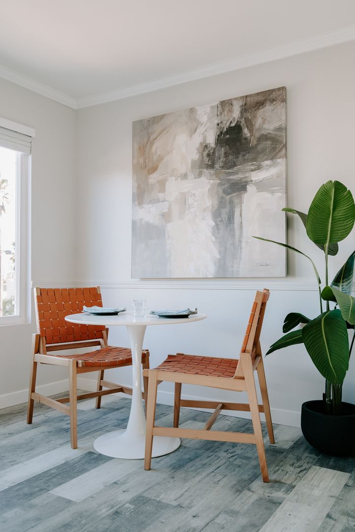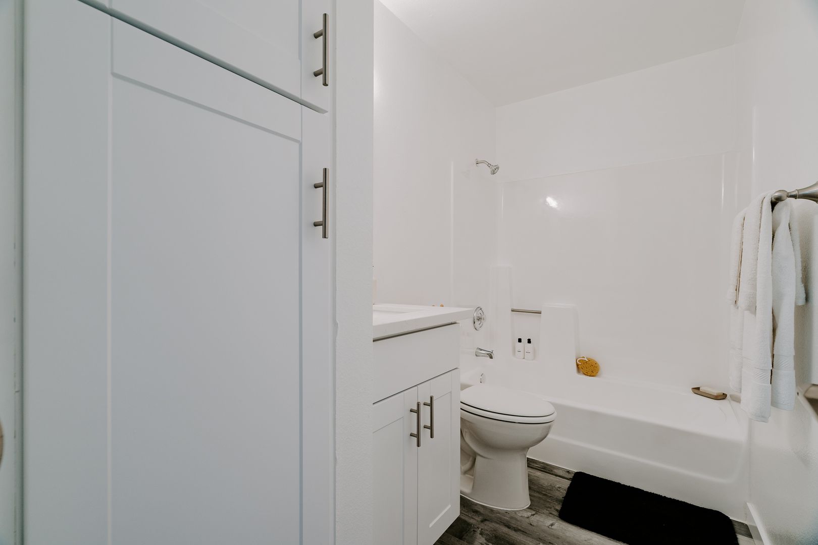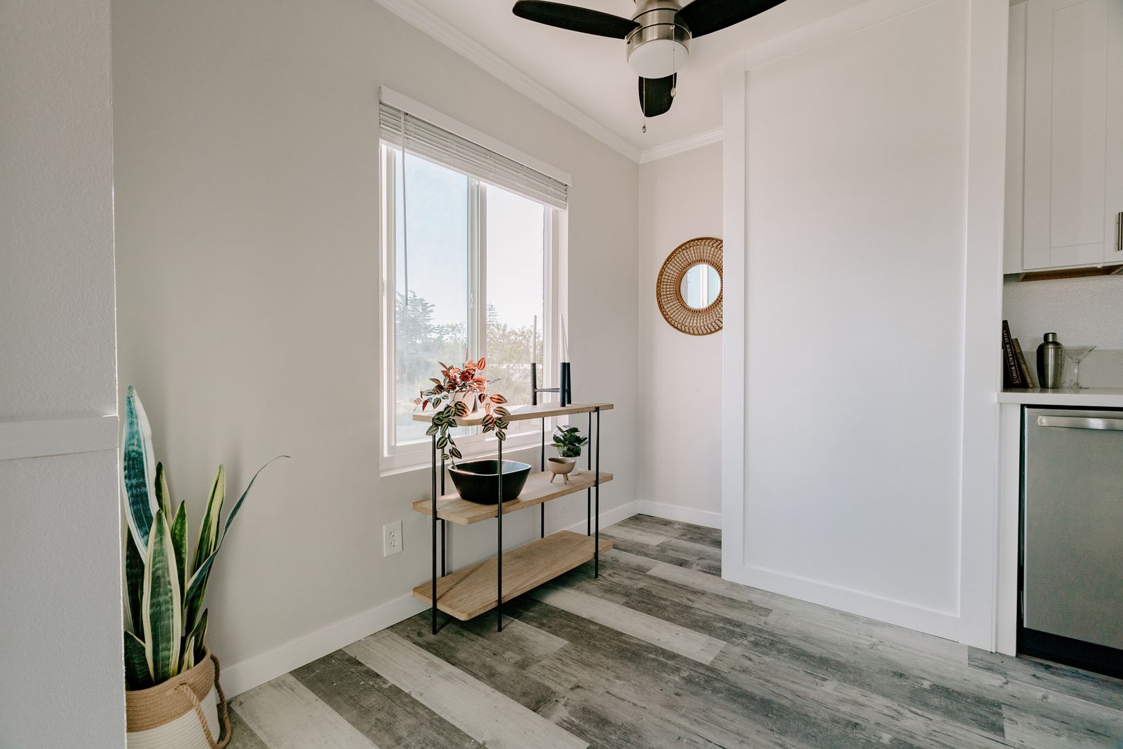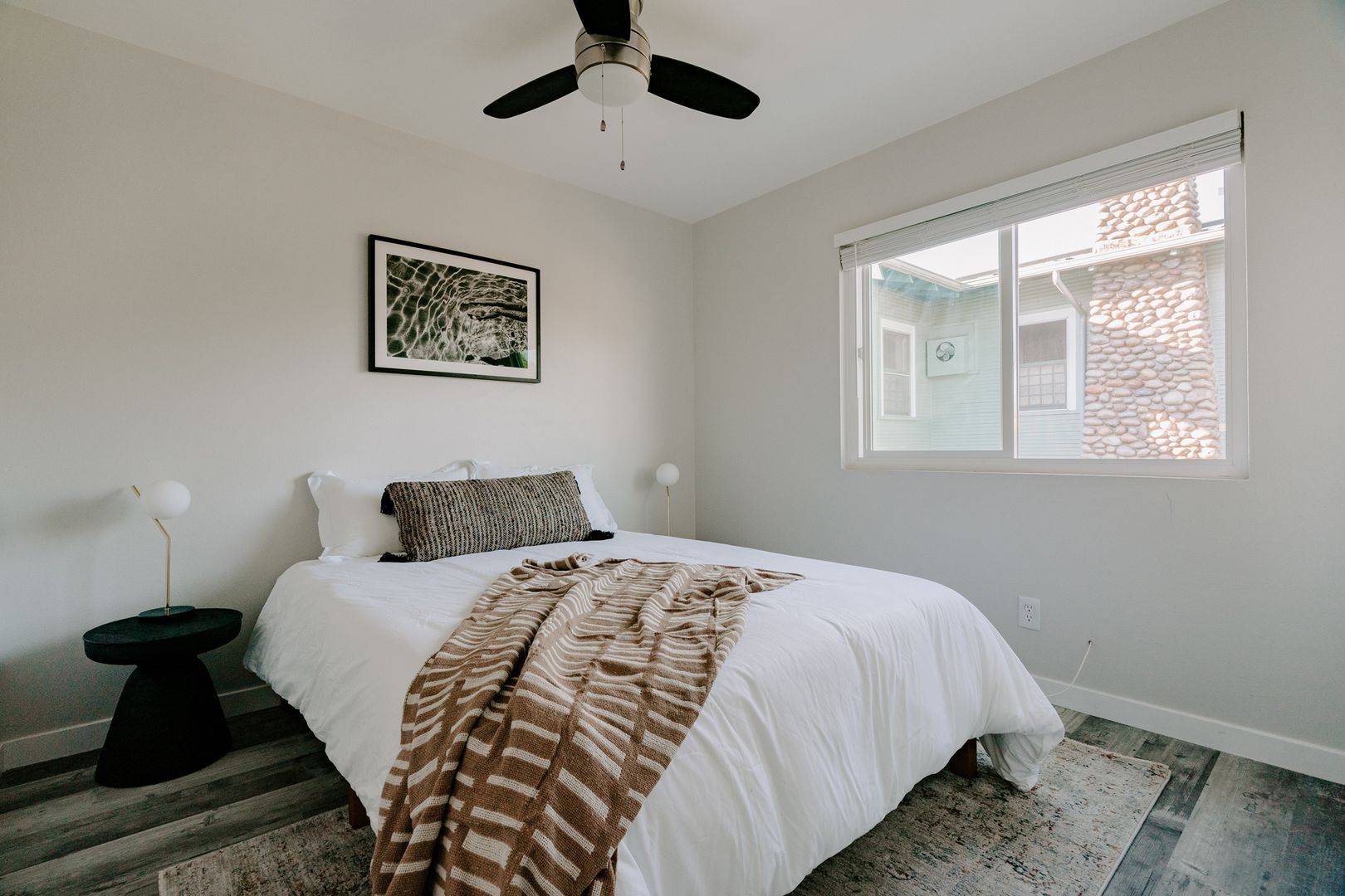 The kitchen features a gas stove, dishwasher, refrigerator, and in-unit washer and dryer and private patio. Enjoy cooking and entertaining on beautiful quartz countertops with updated cabinets. Each bedroom is equipped with mini-split AC for comfort, along with ceiling fans in all bedrooms. The apartment has plank flooring and freshly painted walls, creating a bright and inviting atmosphere.