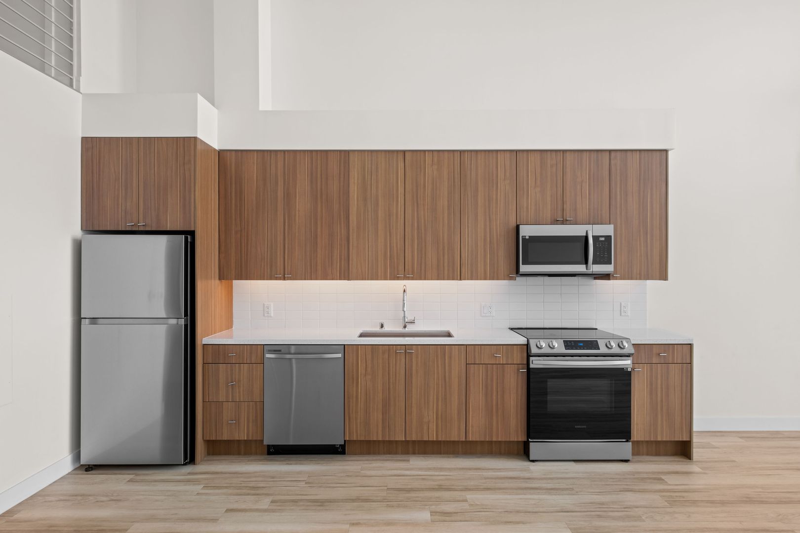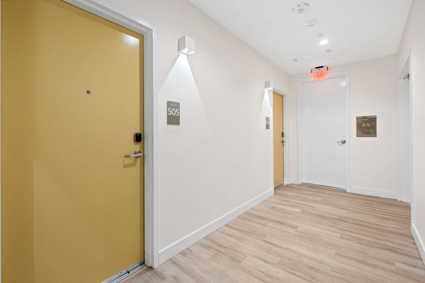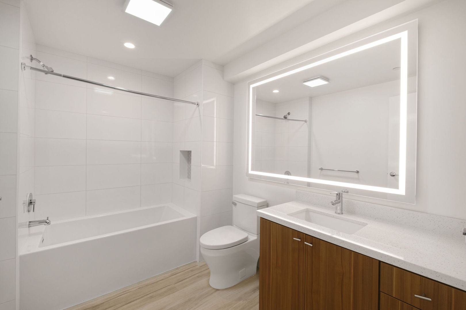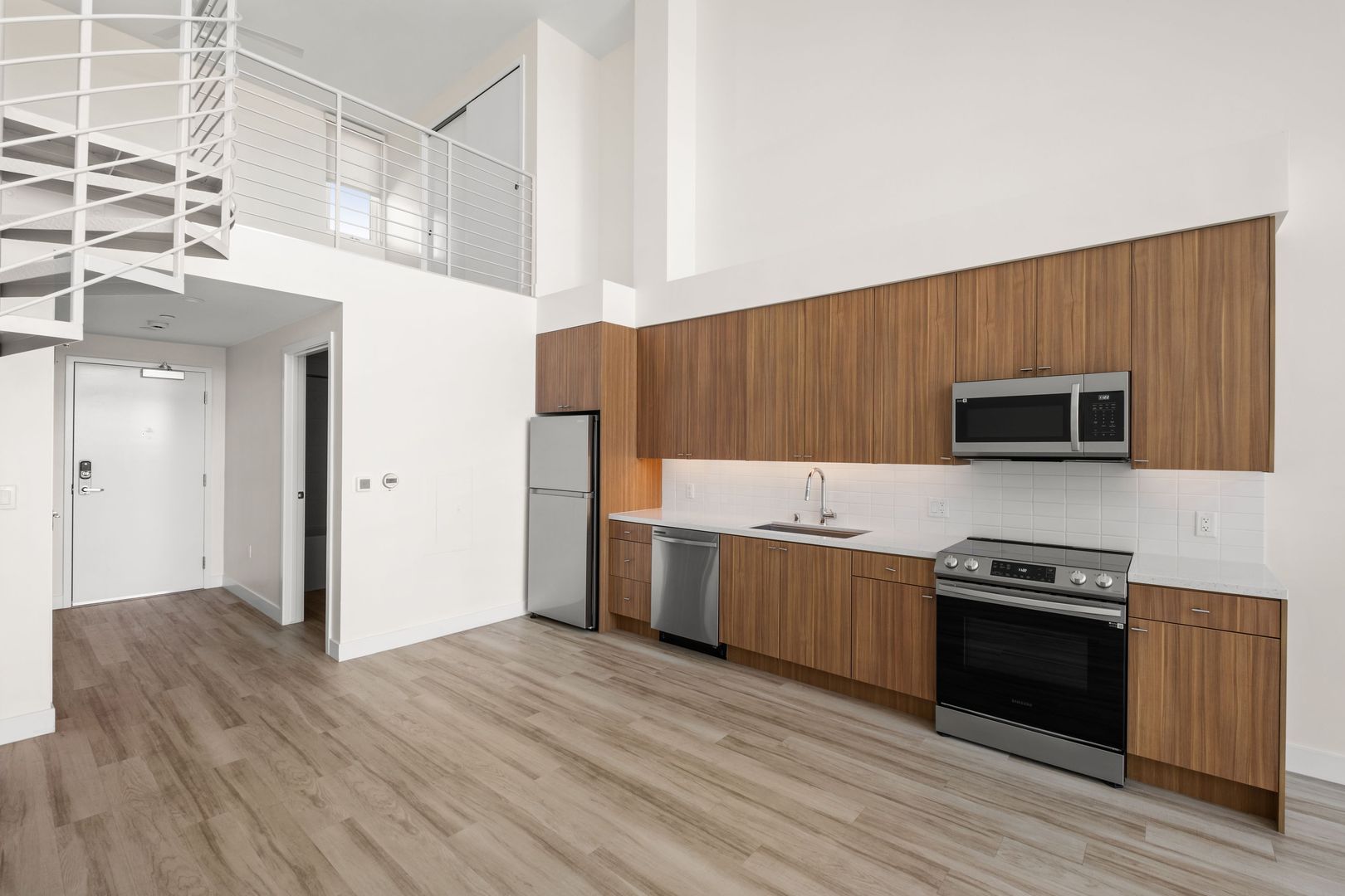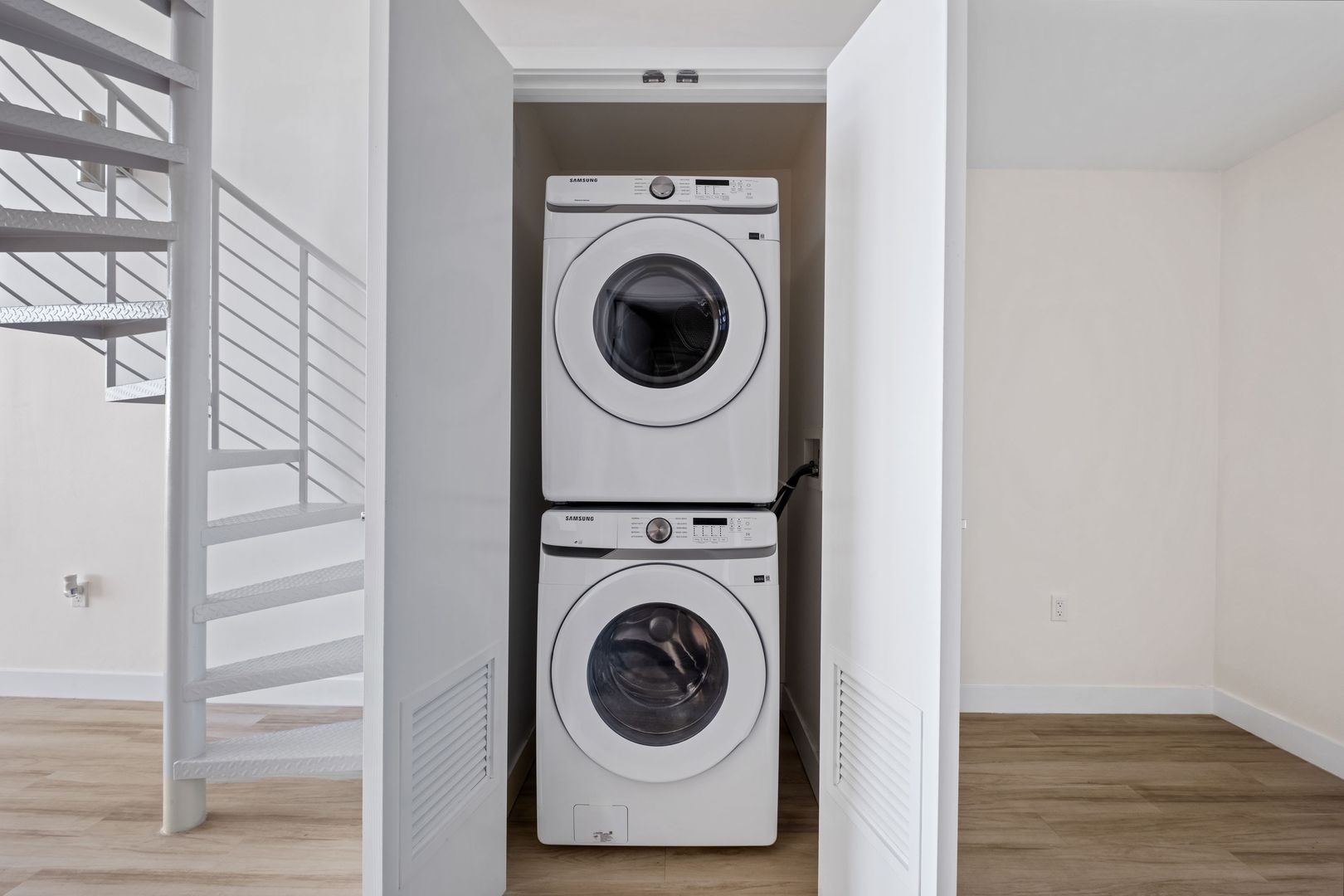 The main level features a spacious open-concept living and dining area filled with natural light, flowing to a private balcony — the perfect spot to relax or entertain while enjoying city and bay views. The modern kitchen offers sleek cabinetry, contemporary appliances, and ample storage. In-unit washer and dryer, central air conditioning, and smart keyless entry provide everyday convenience.
