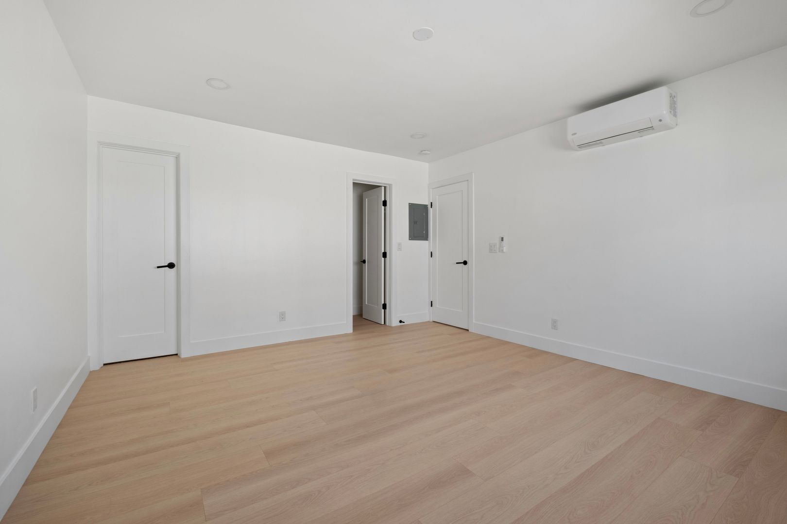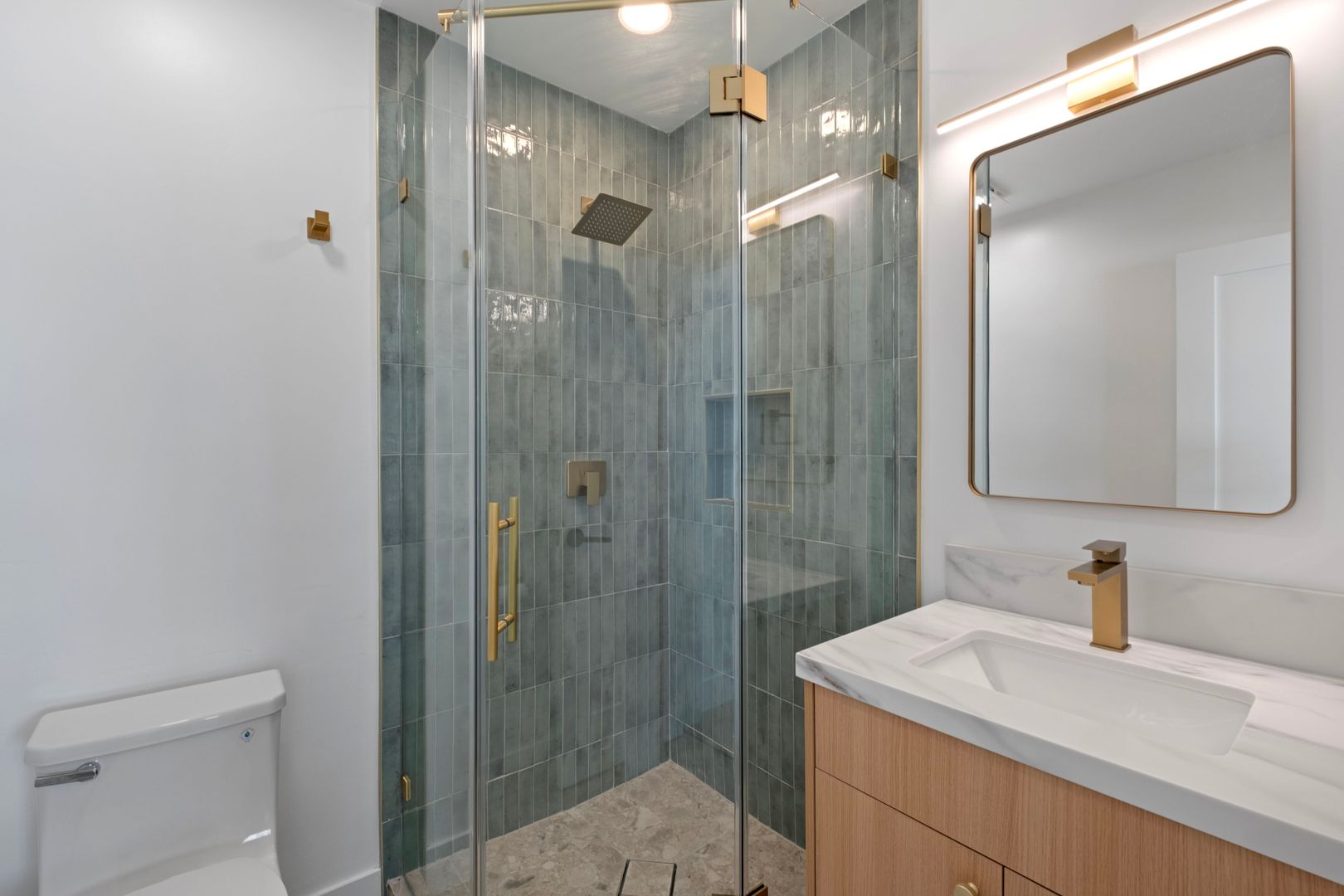 The primary bedroom includes a large walk-in closet, while the second bedroom also offers generous storage and comfort. Both bedrooms include new window coverings and dedicated A/C units for personalized climate control. The bathrooms have been completely upgraded with marble-style vanities, gold fixtures, custom tile work, and glass-enclosed showers, providing a spa-like experience. The hallway offers multiple built-in storage closets, adding convenience and organization throughout the home.