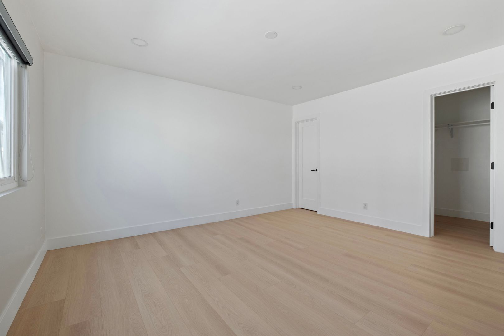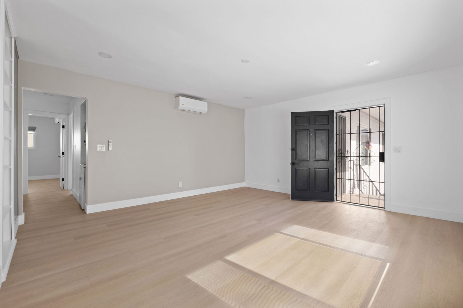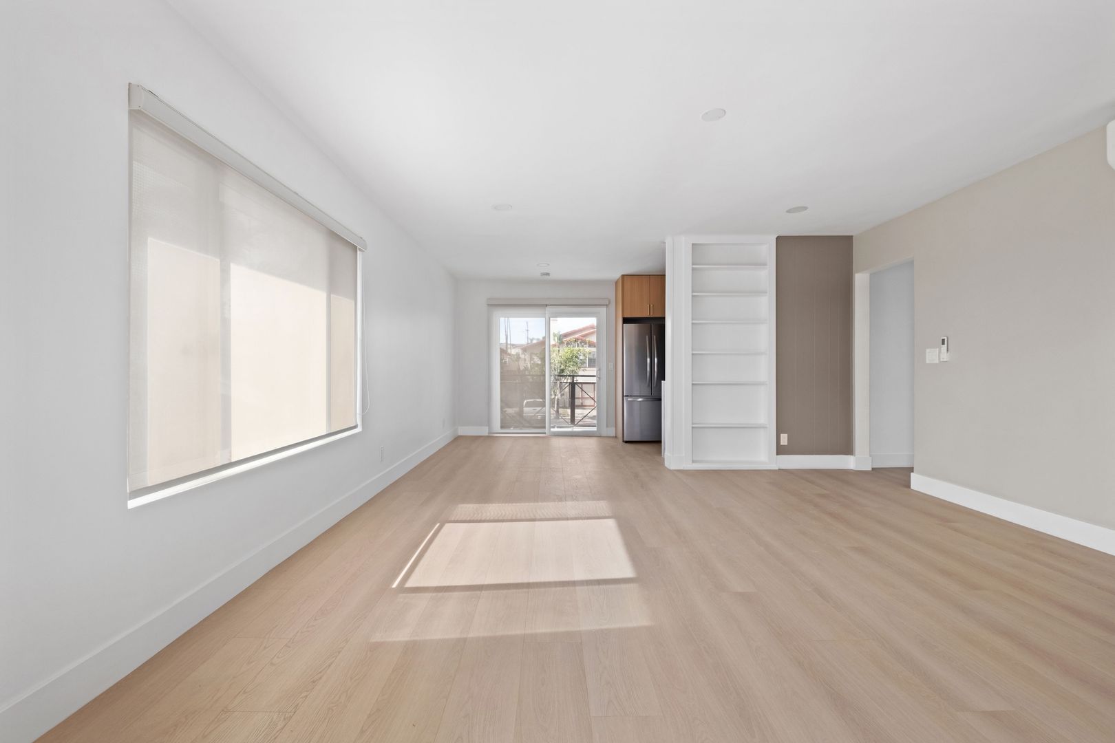 Filled with natural light, the open-concept living area includes wide-plank wood-style flooring, recessed lighting, and fresh neutral tones that create an inviting atmosphere. The designer kitchen features new stainless steel appliances, sleek cabinetry, marble-style countertops, open shelving, gold hardware, and a stylish tile backsplash—perfect for both cooking and entertaining.